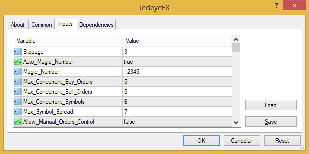 Then you need to right click on JedeyeFX and select Attach to a chart option or just simply drag JedeyeFX onto the chart you want to use it in. A new window regarding JedeyeFX configurations like the one depicted below will appear. Just select the Inputs tab to access to all the configurable sections of JedeyeFX.